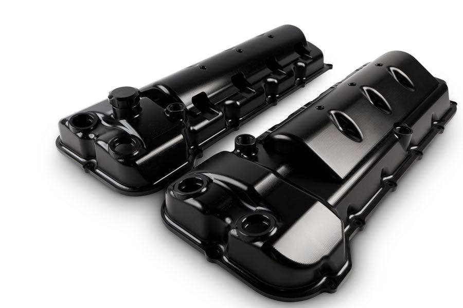 2005-2025 Billet Coyote front engine mounting plates with alternator provision. Finished in black anodizing.